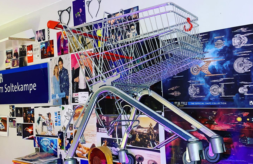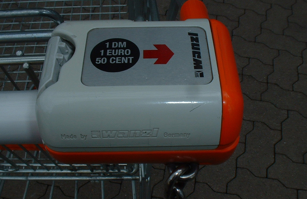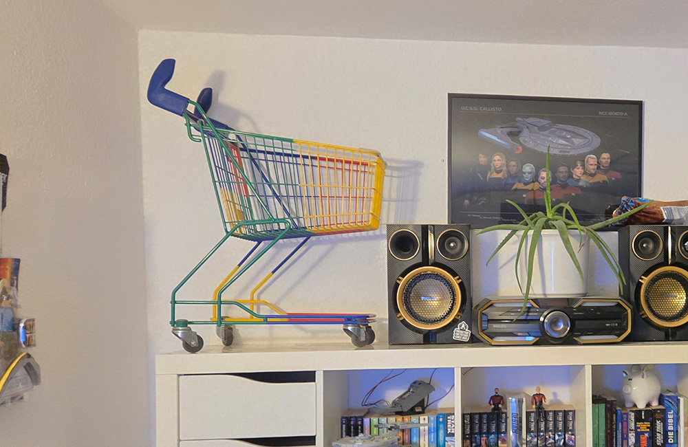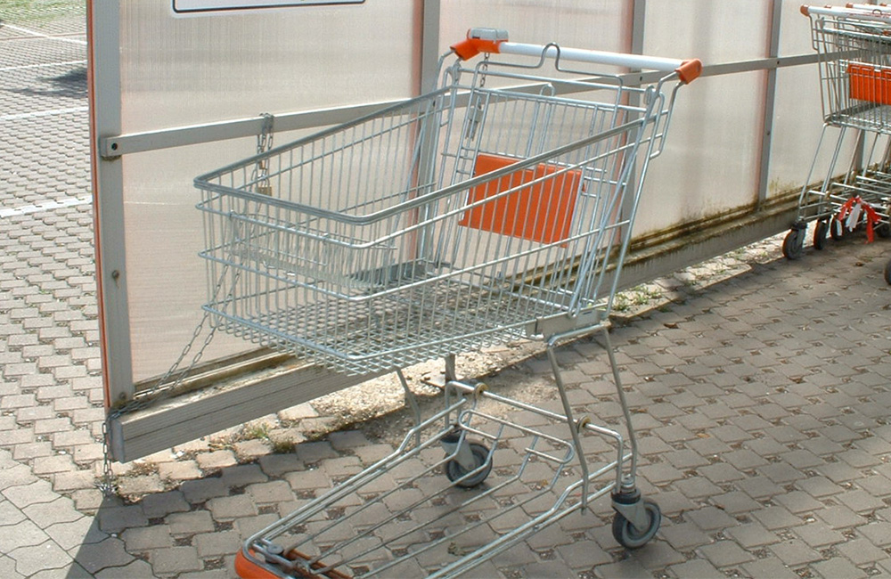 Einkaufswagen kann man gut an die Wand schrauben. Mit den richtigen Dübeln, kann man so auch dinge in dem Einkaufswagen aufbewaren.